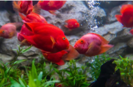 血鹦鹉俗称红财神、财神鱼。其全身鲜艳通红,有着胖嘟嘟的体形和柔柔的鳍条,颜色红彤彤,十分讨喜,成年体长15-20厘米,体副宽厚,体呈椭圆形。幼鱼期体色灰白,成年鱼体体态臃肿,粉红或血红色。